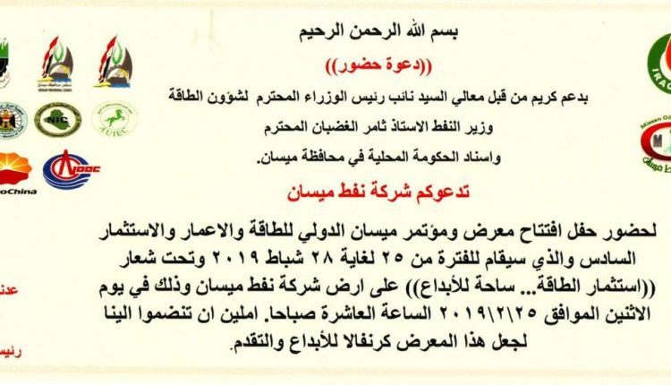 أعلنت شركة نفط ميسان ، اليوم الثلاثاء ، عن قرب انطلاق فعاليات معرض ومؤتمر ميسان السادس للطاقة والاعمار والاستثمار في مقر الشركة وتحت شعار ( استثمار الطاقة .. ساحة إبداع ) , وللفترة من ( ٢٥ – ٢٨ ) من شهر شباط الحالي لعام 2019 .