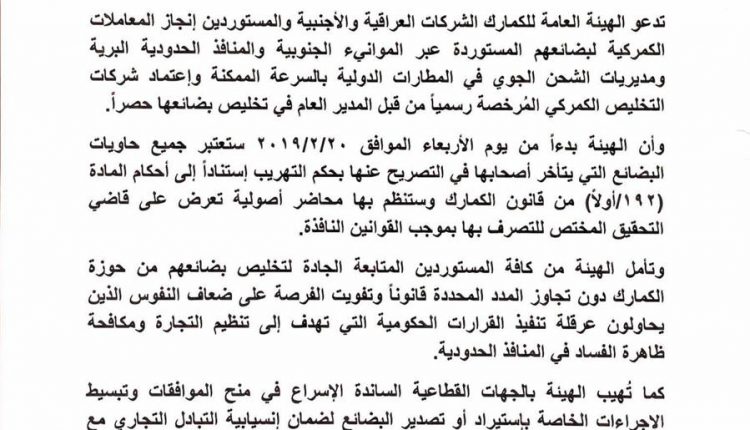 دعت الهيئة العامة للكمارك جميع الشركات العراقية والاجنبية والمستوردين لانجاز المعاملات الكمركية الخاصة ببضائعهم وبالسرعة الممكنة ومن خلال جميع المنافذ الحدودية وفيما يلي نص البيان