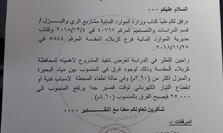 طالب النائب عن تحالف البناء من محافظة كربلاء المقدسة حسين اليساري  وزارة الموارد المائية بخصوص  فتح مياه مبزل الرزازة مباشر الى بحيرة الرزازة  بسبب انخفاض منسوب المياه في البحيرة  وهذا حسب كتاب مديرية  المواد المائية  لمحافظة كربلاء.