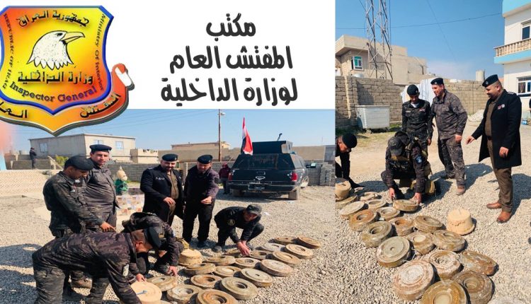 ضبط مكتب المفتش العام لوزارة الداخلية في محافظة نينوى 21 لغماً مضاداً للدروع في أحد الدور المهجورة في ناحية القيارة جنوبي مدينة الموصل من مخلفات عصابات داعش الإرهابي.