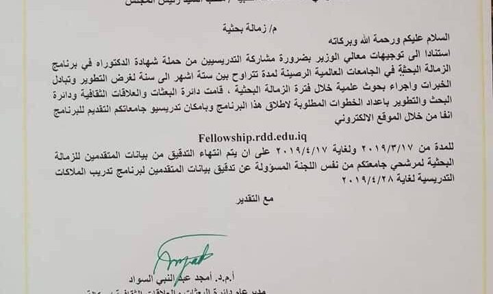 وجه وزير التعليم العالي والبحث العلمي الاستاذ الدكتور قصي السهيل بمشاركة التدريسيين من حملة شهادة الدكتوراه في برنامج الزمالة البحثية في الجامعات العالمية الرصينة لمدة من ستة اشهر الى سنة.