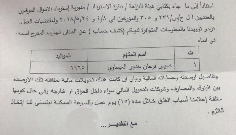 بالوثيقة النزاهة والبنك المركزي يطالبان المصارف وشركات التحويل بتزويدهما بمعلومات عن أموال القيادي في تحالف القرار خميس الخنجر أخبار في يونيو 13, 2018 0 310 شارك 0 310 شارك
