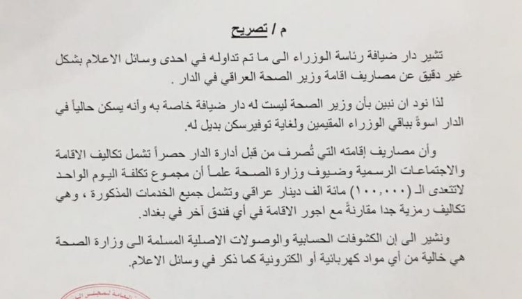 “إن وزير الصحة ليست له دار ضيافة خاصة به وأنه يسكن حاليا في الدار اسوةً بباقي الوزراء المقيمين ولغاية توفير سكن بديل له.