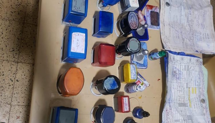 تم ذلك بعد ورود معلومات مؤكدة بوجود اختام مزوره داخل أحد وكلام الأخراج الكمركي، حيث قامت قوة حماية المنفذ وشعبة البحث والتحري بتفتيش احد الكرفانات وتم ضبط المواد التالية ” 22 ختم تعود لدوائر تعمل داخل المنفذ وتستخدم لانجاز المعاملات مع ختم حراري ووصولات ضريبية فارغة ومملوءة مع وصولات إيرادات الدولة فارغة مع أقراص ليزرية عدد 85″.