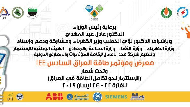 برعاية وزارات، الكهرباء، والنفط، والصناعة والمعادن، والهيئة الوطنية للاستثمار، وبالتعاون مع شركة مجد الاعمال لتنظيم المعارض والمؤتمرات الدولية، ينطلق يوم الاثنين المقبل الموافق ٢٢ /٤/ ٢٠١٩، معرض ومؤتمر طاقة العراق السادس(IEE)، على ارض معرض بغداد الدولي، ولمدة ثلاثة ايام.