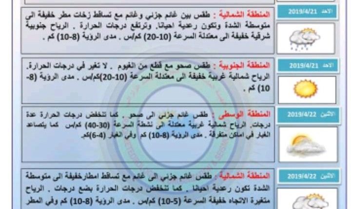 واضاف التقرير: ان يوم الاثنين طقس المنطقة الوسطى غائم جزئي الى صحو و تنخفض درجات الحرارة عدة درجات كما يتصاعد الغبار في اماكن متفرقة ،اما المنطقة الشمالية طقسها غائم الى غائم جزئي مع تساقط امطار خفيفة الى متوسطة الشدة وتنخفض بضع درجات الحرارة فيها .
