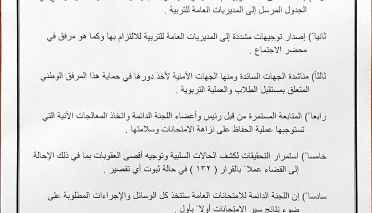 ٤- ان اللجنة الدائمة للامتحانات العامة ستتخذ كل الوسائل والاجراءات المطلوبة على ضوء نتائج سير الامتحانات اولاً باول .
