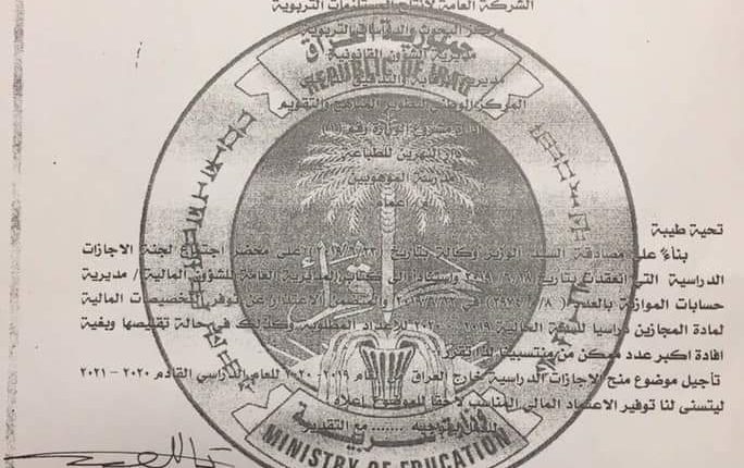 اعلنت وزارة التربية تأجيل منح الاجازات الدراسية خارج العراق للعام الحالي بسبب عدم توفر التخصيصات المالية للأعداد المطلوبة الى السنة القادمة2020- 2021.