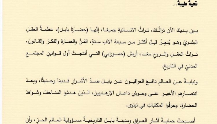 وقال سيادته في نصِّ الرسالة: إن حضارة بابل هي عظمة العقل البشري وهو ينجز قبل أكثر من سبعة آلاف عام الفن والعمارة والفكر والقانون، مضيفًا أن العراقيين دافعوا عن بابل ضد الأشرار قديما وحديثا، مشيرا إلى أنه وبعد الانتصار على وحوش داعش الإرهابيين الذين هدموا شواهد الحضارة في الموصل، أصبحت حماية آثار العراق ومدينة بابل التاريخية مسؤولية العالم الحُر، وأن التصويت لتكون على لائحة التراث العالمي هو حمايةٌ للتراث الإنساني.