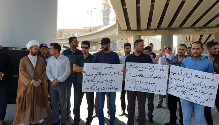 تظاهر العشرات من حملة الشهادات العليا في النجف الاشرف صباح يوم الجمعة الموافق 5 تموز 2019 وذلك للمطالبة بانصافهم في التعيين وتوفير فرص عمل تليق بهم وبمستقبلهم.