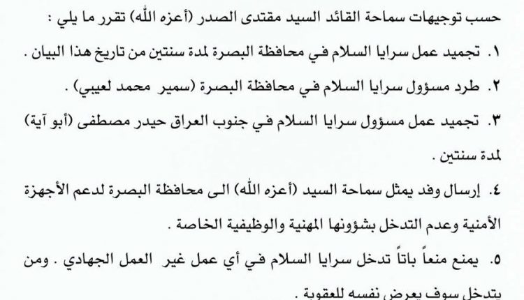 الصدر يجمد عمل سرايا السلام في البصرة ويطرد المسؤول عنهم أخبار في يونيو 27, 2018 0 232 شارك حسب توجيهات السيد مقتدى الصدر تجميد عمل سرايا السلام في البصرة وطرد مسؤولها في المحافظة وأوامر آخرى تتعلق بعمل السرايا وتجميد مسؤولها في الجنوب 0 232 شارك