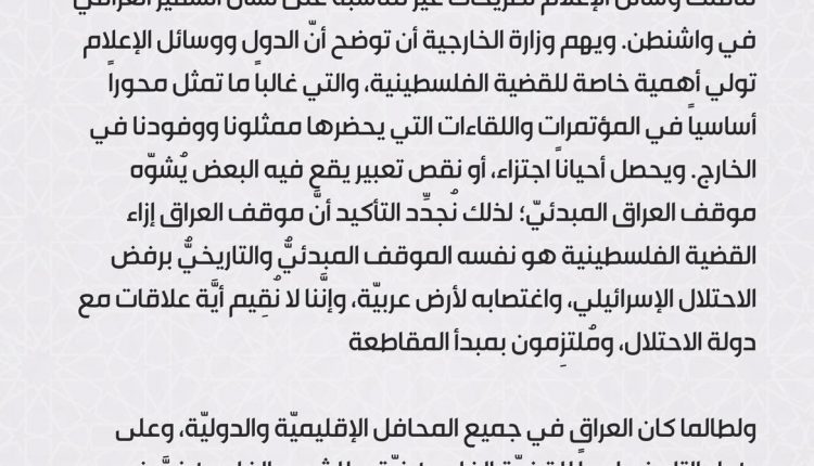 تناقلت وسائل الإعلام تصريحات غير مناسبة على لسان السفير العراقي في واشنطن. ويهم وزارة الخارجية أن توضح أنّ الدول ووسائل الإعلام تولي أهمية خاصة للقضية الفلسطينية، والتي غالباً ما تمثل محوراً أساسياً في المؤتمرات واللقاءات التي يحضرها ممثلونا ووفودنا في الخارج. ويحصل أحياناً اجتزاء، أو نقص تعبير يقع فيه البعض يُشوّه موقف العراق المبدئيّ؛ لذلك نُجدِّد التأكيد أنَّ موقف العراق إزاء القضية الفلسطينية هو نفسه الموقف المبدئيُّ والتاريخيُّ برفض الاحتلال الإسرائيلي، واغتصابه لأرض عربيّة، وإنَّنا لا نُقِيم أيَّة علاقات مع دولة الاحتلال، ومُلتزِمون بمبدأ المقاطعة.
