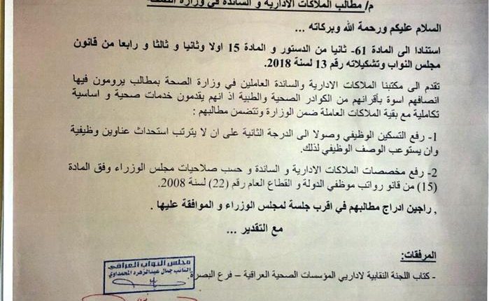 وتابع المحمداوي” قد دعونا في شهر (نيسان الماضي) برفع التسكين الوظيفي عن الملاكات الإدارية والساندة في وزارة الصحة ، وطالبنا بادراج مطالبهم بأقرب جلسة لمجلس الوزراء للموافقة عليها ، وخاطبنا في مناسبات عديدة الجهات المختصة لتحقيق مطالب هذه الشريحة ، ففي الكتاب ذوي العدد 380 في 7 / نيسان / 2019 طالبنا رئيس مجلس الوزراء بانصاف هذه الشريحة ورفع التسكين عنهم ورفع مخصصاتهم . فيما اجاب مكتب رئيس الوزراء بالإشارة فقط لقرار مجلس الوزراء رقم (61) فقط ولم ينصف الملاكات الادارية والساندة ، كما وخاطبنا مجددا رئيس الوزراء للموضوع نفسه في 16 / 7 / 2019 للتأكيد على تخصيص نسبة (30%) من الراتب الاسمي الملاكات الادارية والساندة لكن الى الان مجلس الوزراء لم ينظر بعين المساواة والعدالة للملاكات الادارية والساندة في وزارة الصحة”.