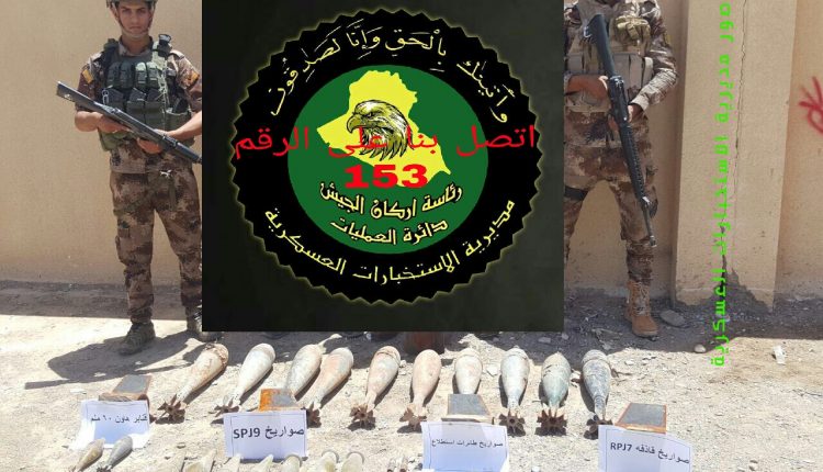 صرح الناطق باسم مركز الإعلام الأمني العميد يحيى رسول”ان مفارز مديرية الاستخبارات العسكرية في الفرقة 20 واستناداً الى معلومات استخبارية دقيقة تتمكن من الوصول الى كدس للعتاد في ناحية بادوش شمالي مدينة الموصل من مخلفات عصابات داعش الارهابية وتضبط بداخله( 6 صواريخ طائرة استطلاع و 7 أخرى نوع RBG7 و16 قنبرة هاون عياري 120- 60 ملم و 3 صواريخ SPG9) وقد تم تدميرها موقعياً من قبل مفارز هندسة الفرقة.