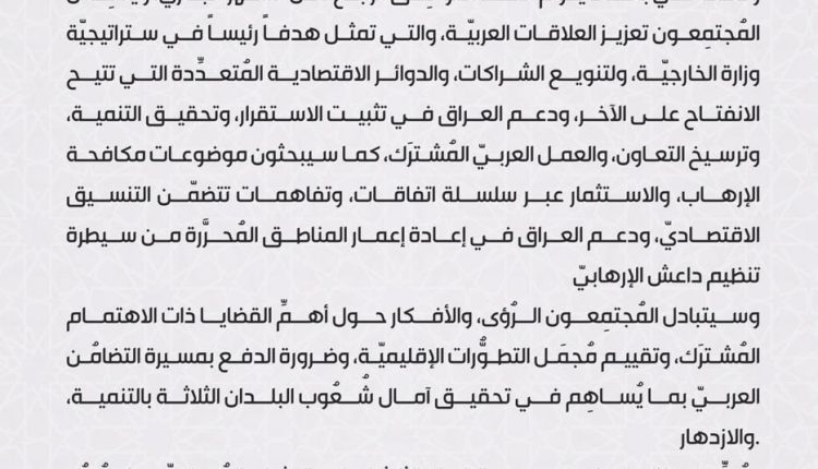 سينعقد الاجتماع الثلاثيّ على مُستوى وزراء خارجيّة العراق، والأردن، ومصر. وذلك في بغداد يوم الأحد المُوافِق الرابع من الشهر الجاري. ويُناقِش المُجتمِعون تعزيز العلاقات العربيّة، والتي تمثل هدفاً رئيساً في ستراتيجيّة وزارة الخارجيّة، ولتنويع الشراكات، والدوائر الاقتصادية المُتعدِّدة التي تتيح الانفتاح على الآخر، ودعم العراق في تثبيت الاستقرار، وتحقيق التنمية، وترسيخ التعاون، والعمل العربيّ المُشترَك، كما سيبحثون موضوعات مكافحة الإرهاب، والاستثمار عبر سلسلة اتفاقات، وتفاهمات تتضمّن التنسيق الاقتصاديّ، ودعم العراق في إعادة إعمار المناطق المُحرَّرة من سيطرة تنظيم داعش الإرهابيّ