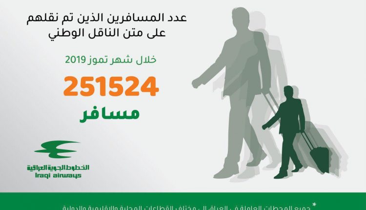 اعلنت ادارة الشركة العامة للخطوط الجوية العراقية احدى تشكيلات وزارة النقل، عن تحقيقها زيادة في اعداد المسافرين الذين تنقلوا على متن طائرات الناقل الوطني الى مختلف الوجهات المحلية والاقليمية والدولية خلال شهر تموز من العام الحالي وبنسب امتلاء عالية.
