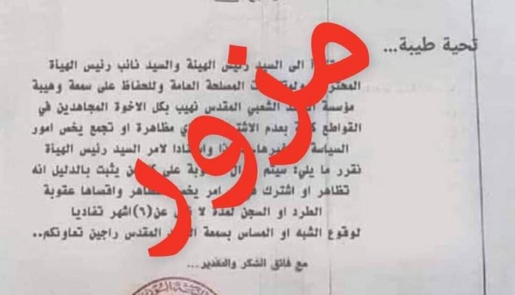 تنفي مديرية الادارة المركزية في هيئة الحشد الشعبي ما تداول عن توجيه منتسبي الحشد بعدم المشاركة بالتظاهرات الشعبية، وتؤكد ان الكتاب الذي تناقلته بعض الصفحات والمواقع مزور وغير حقيقي.