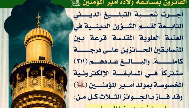 اختتمت شعبة التبليغ الديني التابعة لقسم الشؤون الدينية في العتبة العلوية المقدسة يوم أمس 15 رجب الأصب المسابقة الإلكترونية الخاصة بمولد أمير المؤمنين (عليه السلام) تحت عنوان مسابقة في كتاب.