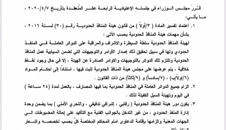 اتخذ مجلس الوزراء جملة من القرارات في جلسته الاعتيادية في 7 نيسان 2020 والتي عقدت برئاسة نائب رئيس الوزراء وزير النفط السيد ثامر الغضبان. ومن ضمن القرارات المتخذة قرارات ملزمة التطبيق لتعزيز دور هيأة المنافذالحدودية في الإشراف والرقابة على الدوائر العاملة في المنافذ الحدوديةوضمان وحدة الإدارة في المنافذ كافة.