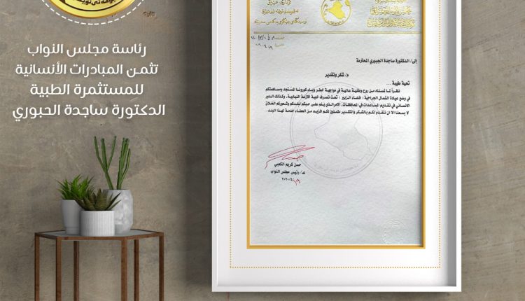 كرمت رئاسة مجلس النواب العراقي ، المستثمرة الطبية الدكتورة ساجدة الجبوري تثمينا لجهودها بمواجهة وتدبير آثار جائحة كورونا استجابة لنداء الواجب الوطني .