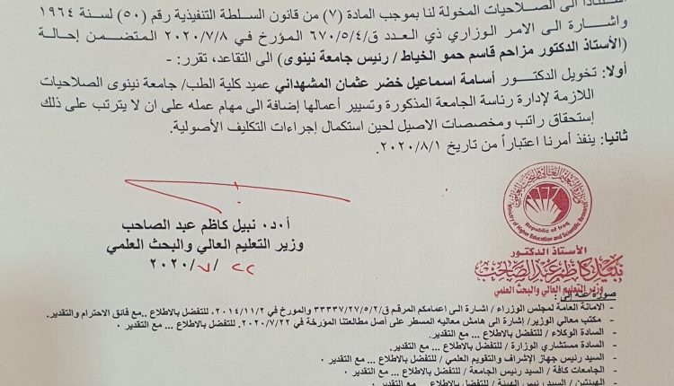 وزير التعليم يكلف رئيسا جديدا لجامعة نينوى