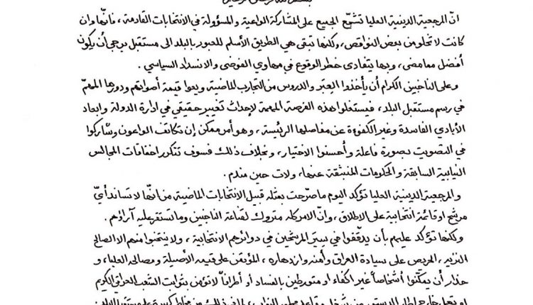 ولكنها تؤكد عليهم بأن يدقّقوا في سِيَر المرشحين في دوائرهم الانتخابية ولا ينتخبوا منهم الا الصالح النزيه، الحريص على سيادة العراق وأمنه وازدهاره، المؤتمن على قيمه الأصيلة ومصالحه العليا، وحذار أن يمكّنوا أشخاصاً غير أكفاء أو متورطين بالفساد أو أطرافاً لا تؤمن بثوابت الشعب العراقي الكريم أو تعمل خارج إطار الدستور من شغل مقاعد مجلس النواب، لما في ذلك من مخاطر كبيرة على مستقبل البلد.