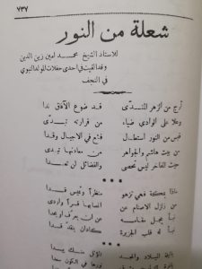 نشرت المجلة في عددها العاشر من السنة السادسة بتأريخ شهر رجب ١٣٦٧ هج والموافق شهر مايس ١٩٤٨ م قصيدة بعنوان ( شعلة من النور ) للأستاذ محمد أمين زين الدين – رحمه الله – وقد القيت في أحدى حفلات المولد النبوي الشريف، وتكونت من ست وستين بيتاً شعرياً.