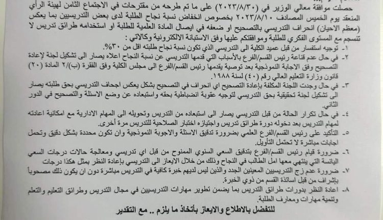 تفاجأ أساتذة الجامعات العراقية صباح يوم أمس بصدور كتاب جديد عن قسم التقويم العلمي / جهاز الإشراف والتقويم العلمي في وزارة التعليم العالي والبحث العلمي بالرقم (ج ع /م.ه/2910) في 31/8/2023 بناءً على المقترحات المطروحة في الاجتماع الثامن لهيأة الرأي التي تضم رؤساء الجامعات ووكلاء الوزارة بتأريخ 10/8/2023 .