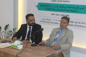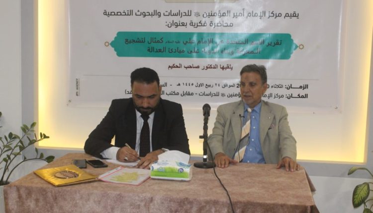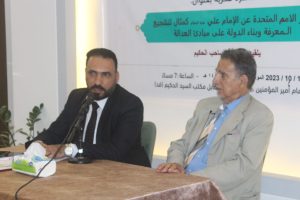 أقام مركز الإمام أمير المؤمنين للدراسات والبحوث التخصصية في النجف الاشرف ندوه فكرية و ثقافية للإمام علي (ع) بعنوان “تقرير الأمم المتحدة عم الإمام علي (ع) كمثال لتشجيع المعرفة وبناء الدولة على مبادئ العدالة” وقد ألقى الندوة المحاضر الدكتور الدكتور صاحب الحكيم وبإدارة الاستاذ المساعد الدكتور حسنين جابر الحلو حيث شهدت الندوة حضور واسع من فضلاء الحوزة العلمية و الأساتذة الجامعيين وإعلاميين ومثقفين