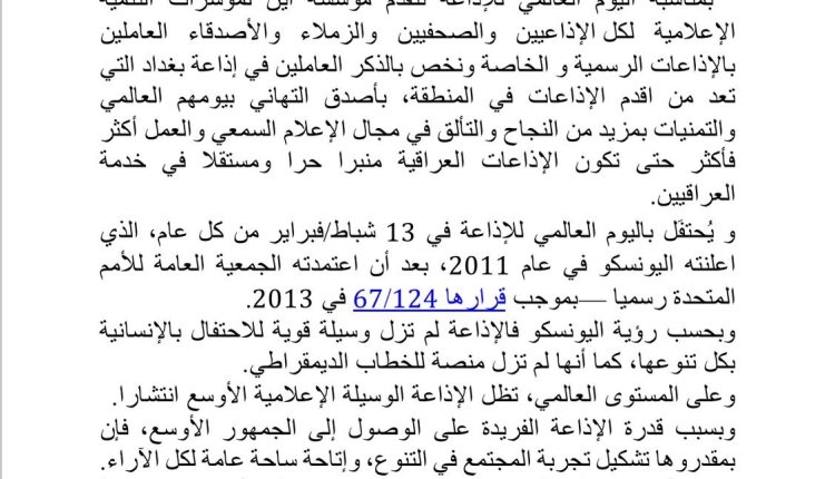 بمناسبة اليوم العالمي للاذاعة تتقدم مؤسسة أين لمؤشرات التنمية الأعلامية لكل الاذاعيين والصحفيين والزملاء والأصدقاء العاملين بالإذاعات الرسمية و الخاصة ونخص بالذكر العاملين في اذاعة بغداد التي تعد من اقدم الاذاعات في المنطقة، بأصدق التهاني بيومهم العالمي والتمنيات بمزيد من النجاح والتألق في مجال الإعلام السمعي والعمل أكثر فأكثر حتى تكون الإذاعات العراقية منبرا حرا ومستقلا في خدمة العراقيين.