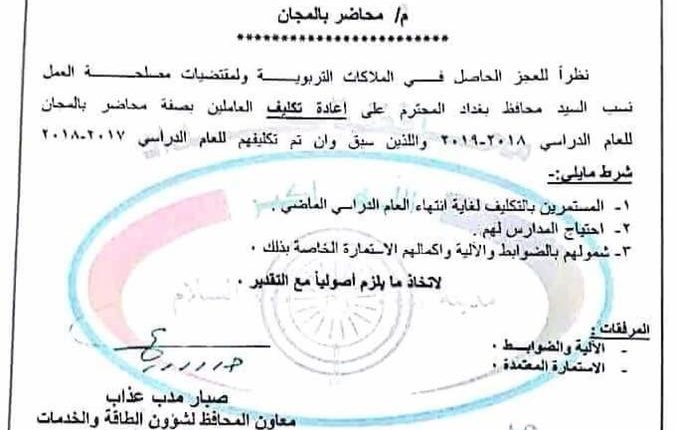 بيان للمكتب الإعلامي لمحافظ بغداد اكد ” ان وثيقة صدرت من مكتب معاون محافظ بغداد لشؤون التربية صبار مدب تظهر صدور توجيه يشمل (المستمرين بالتكليف لغاية انتهاء العام الدراسي الماضي) وبحسب احتياج المدرسة لهم ، مشيرا الى شمولهم بالضوابط والالية واكمالهم الاستمارة الخاصة بهم “.