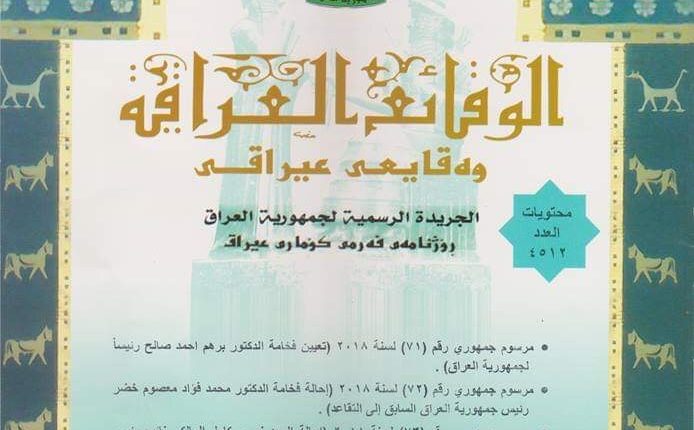 وقال مدير عام الدائرة هند عبد جميغ: ان العدد تضمن مرسوم جمهوري رقم (71) لسنة 2018 (تعيين فخامة الدكتور برهم أحمد صالح رئيساً لجمهورية العراق، بالاضافة الى مرسوم جمهوري رقم (72) لسنة 2018 (إحالة فخامة الدكتور محمد فؤاد معصوم خضر رئيس جمهورية العراق السابق إلى التقاعد.