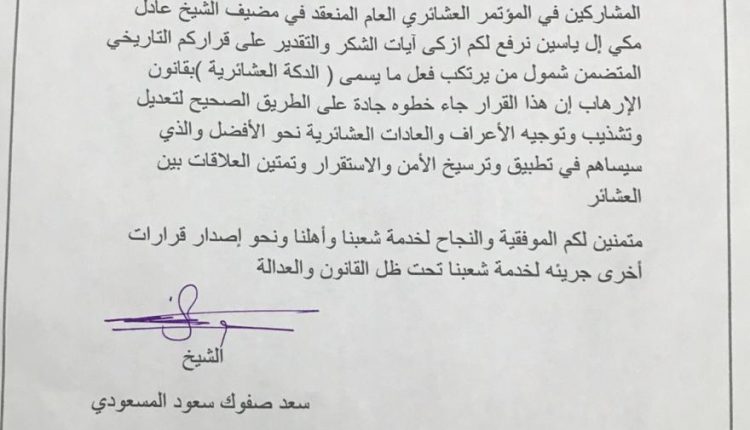 وأضاف البيان ان “العشائر في المحافظة وصفت القرار بالخطوة الجادة على الطريق الصحيح لتعديل وتشذيب وتوجيه الاعراف والعادات العشائرية نحو الافضل والذي سيساهم في تطبيق وترسيخ الامن والاستقرار وتمتين العلاقات بين العشائر “.