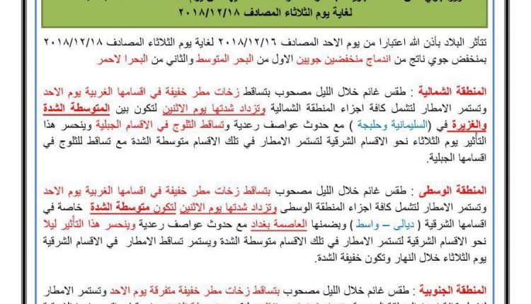 وقالت الهيئة في تقرير جوي : ان المنطقة الشمالية من البلاد طقسها غائم خلال اليل مصحوب بتساقط امطار خفيفة في اقسامها الغربية يوم الاحد وتستمر الامطار وتزداد شدتها يوم الاثنين لتكون بين المتوسطة الشدة والغزيرة مع حدوث عواصف رعدية وتساقط ثلوج في الأقسام الجبلية .