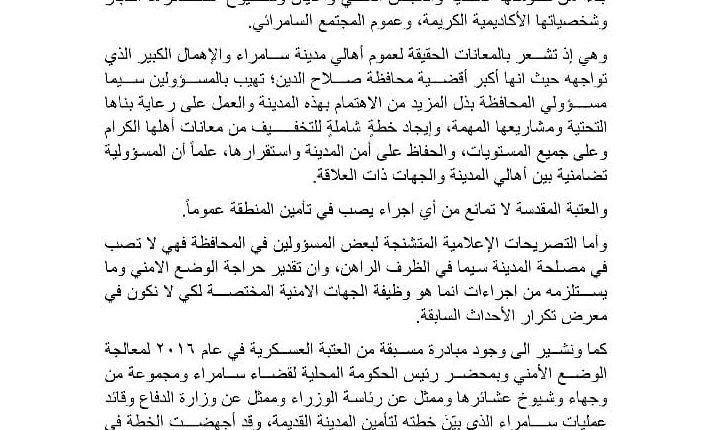 العتبة العسكرية تصدر بيان حول التصريحات لبعض المسؤولين أخبار في يناير 7, 2019 0 225 شارك اصدرت العتبة العسكرية بيانا حول التصريحات الاخيرة وما اثير انها تعمل على منع اهالي سامراي من التواجد في المنطقة القديمة وفيما يلي نص البيان 0 225 شارك