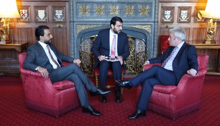 رئيس مجلس النواب محمد الحلبوسي يلتقي رئيس مجلس العموم البريطاني جون بيركو