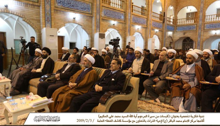أقام مركز الامام محمد الباقر (عليه السلام) لإحياء التراث بالتعاون مع مؤسسة كاشف الغطاء العامة ندوة فكرية تخصصية تعنى بإحياء تراث أهل البيت (عليهم السلام) بعنوان (قبسات من سيرة المرحوم آية الله السيد محمد علي الحكيم (قدس سره)) وذلك على باحة المدرسة المهدية الدينية، أدار المحاضرة السيد نبأ الحمامي مدير مركز الإمام محمد الباقر (عليه السلام)، وقد حاضر خلالها حجة الاسلام والمسلمين السيد عز الدين الحكيم بمحاضرة فكرية سلط خلالها الاضواء على سيرة اية الله المرحوم السيد محمد علي الحكيم (قدس سره) بجوانبها العلمية والاجتماعية والتربوية، وقد أشاد المحاضر في بداية محاضرته بالجهود المبذولة من قبل القائمين على هذه الندوة، مشيداً بدور مركز الامام محمد الباقر (عليه السلام) ومؤسسة كاشف الغطاء العامة على احياء تراث العلماء الأعلام، قائلاً ” اتقدم بجزيل الشكر الى مؤسسة كاشف الغطاء العامة لما لهذه الاسرة من فضل في بناء حوزة النجف الاشرف ولما لها من عمق تاريخي ويذكر أن سماحة السيد الجد (قدس سره) كان من سكنة مدارس آل كاشف الغطاء ويذكرها بكل فضل.